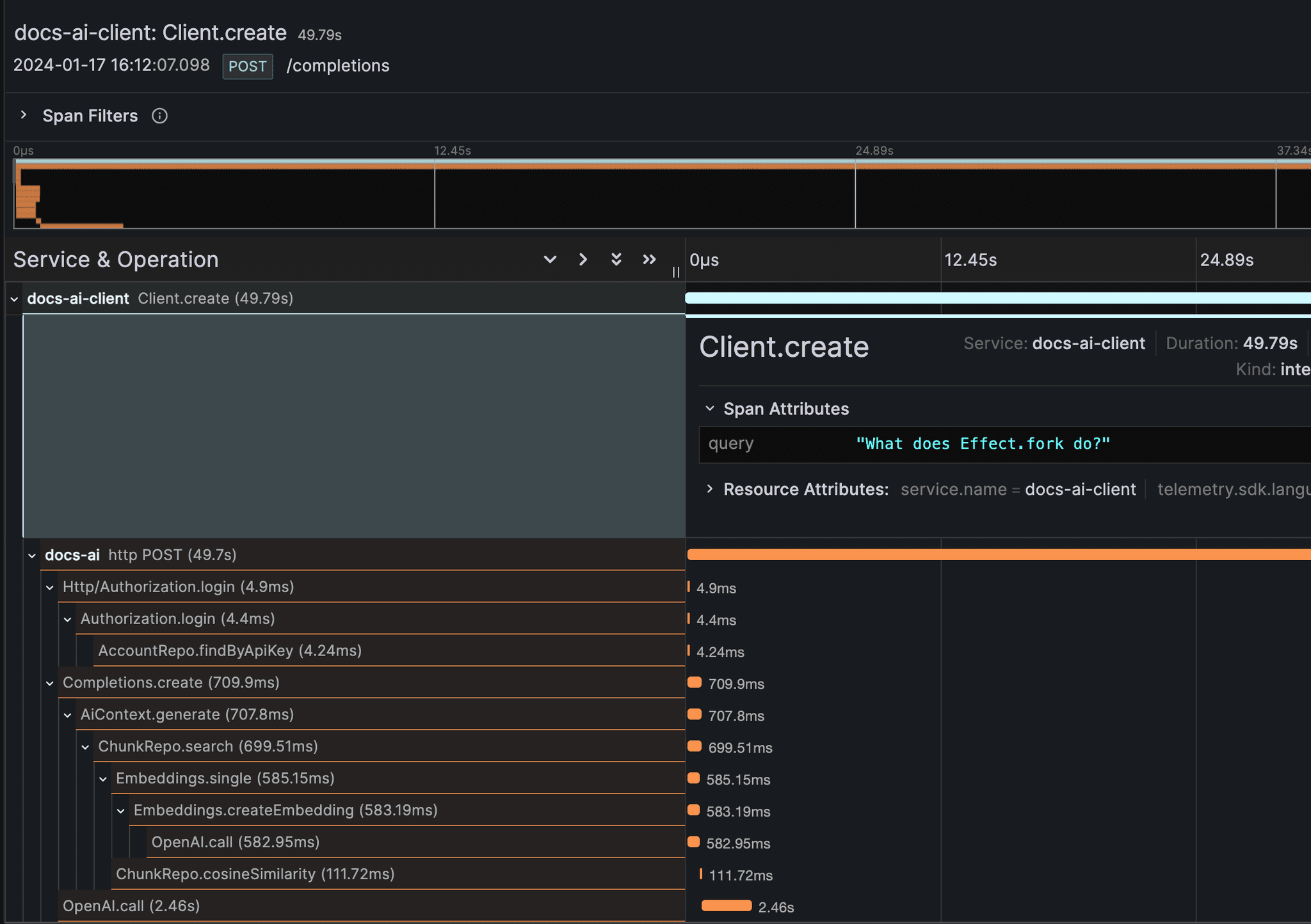 The built-in support for tracing is first-class. Effect integrates seamlessly with OpenTelemetry to give you full visibility over your application's performance.